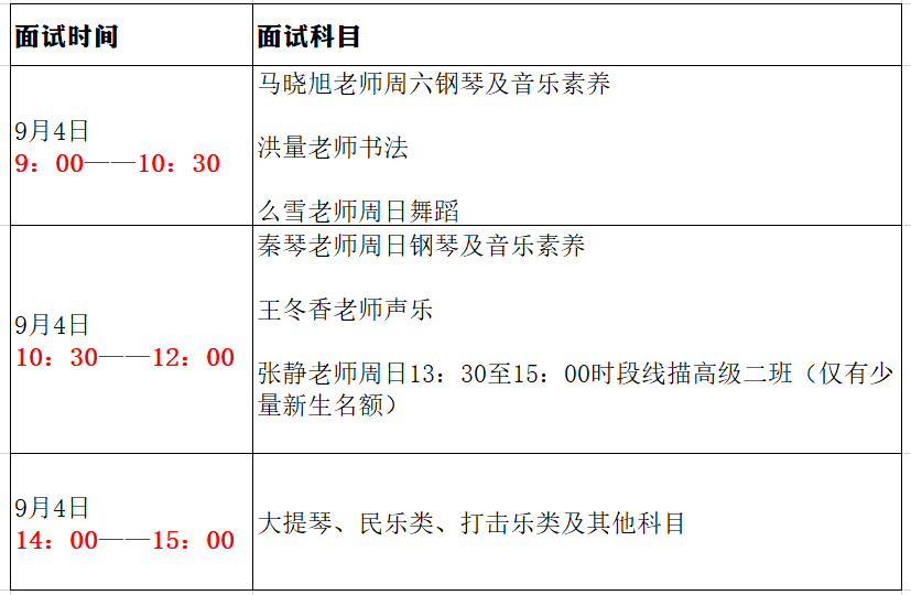 1.所有招新生的课程均需面试,无面试时间的课程说明不招新生,请家长不要报名。美术课程仅周日13:30——15:00时段有少量新生名额,国学各班因课程延续性问题均不招新生。